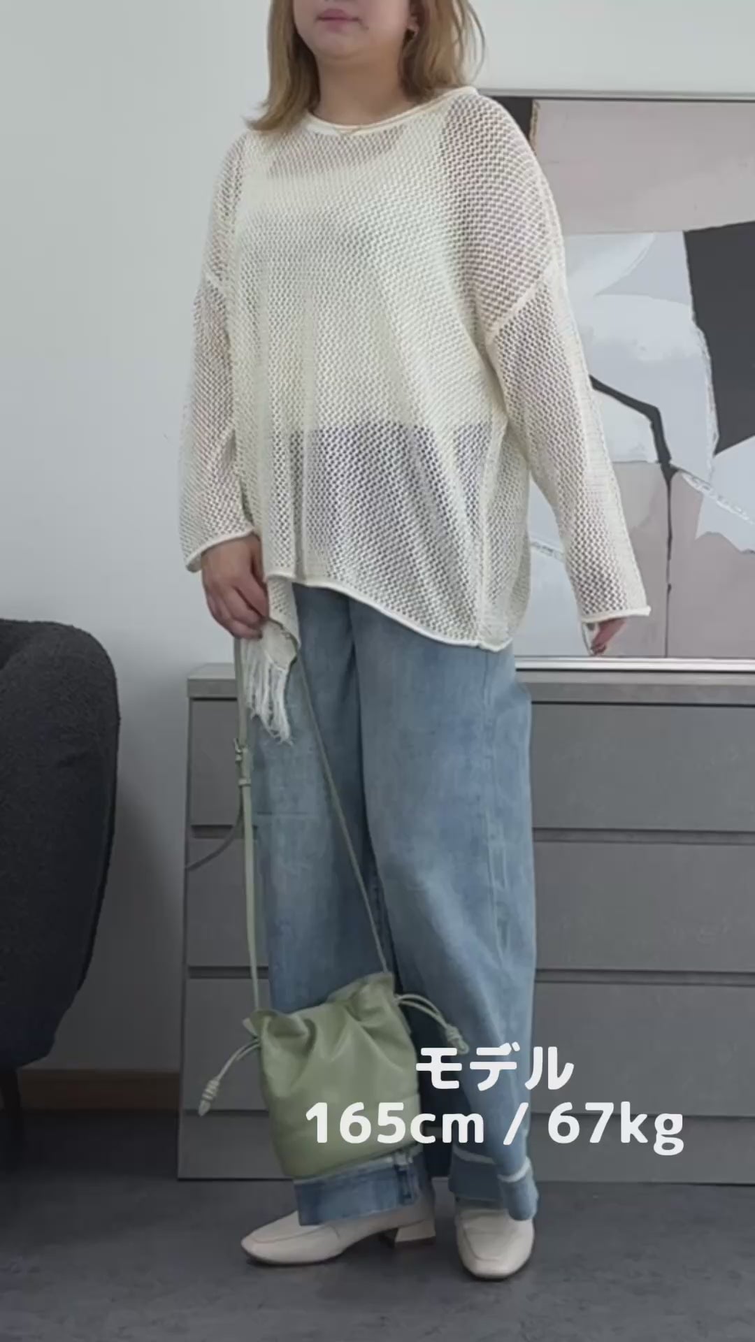 真夏も長袖を着たい方にも必見。今からすぐに着れて今夏大活躍するメッシュトップス。二の腕は出したくないけど、暑い。。。そんなちょいぽちゃさんのご意見を形にし、涼しく夏も着れるトップスに仕上げました。厚みも硬さもない肌触りのいいメッシュで柔らかく落ちて身体の大きさを軽減します。メッシュトップスは風通しがいいのに暑いというイメージもありますが、その概念を覆すサラサラの柔らかな質感が特徴です。サイドスリットでパツパツになることを防ぎフリンジで垢抜けもプラスします。袖の長さもたっぷりと、首元は小顔見えや肩幅軽減、首元を綺麗に見せるボートネックを採用。やりすぎないおしゃれを提案してくれる1枚です