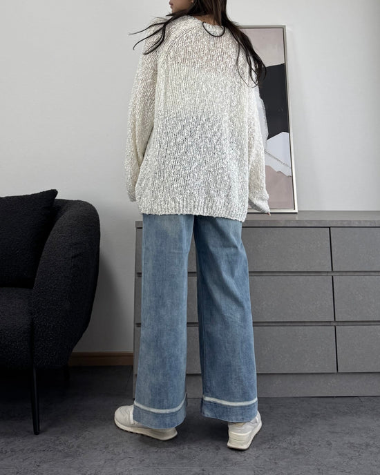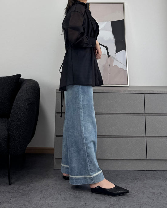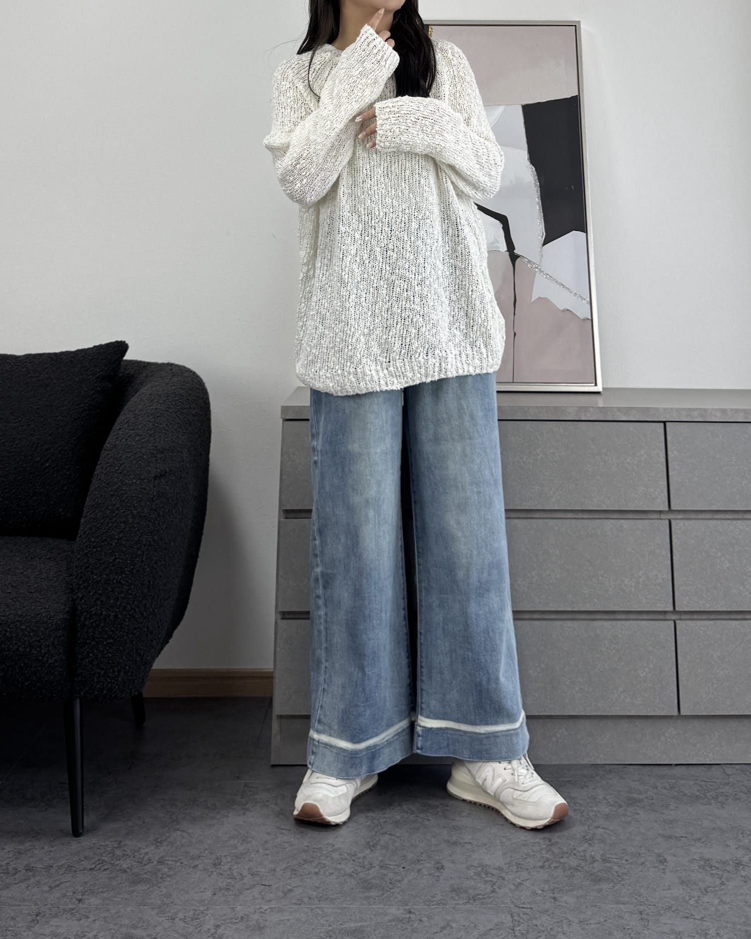シンプルになりすぎないよう、裾には色落ちでラインを施し、デニムのカラーも風合いのあるおしゃれカラーに。