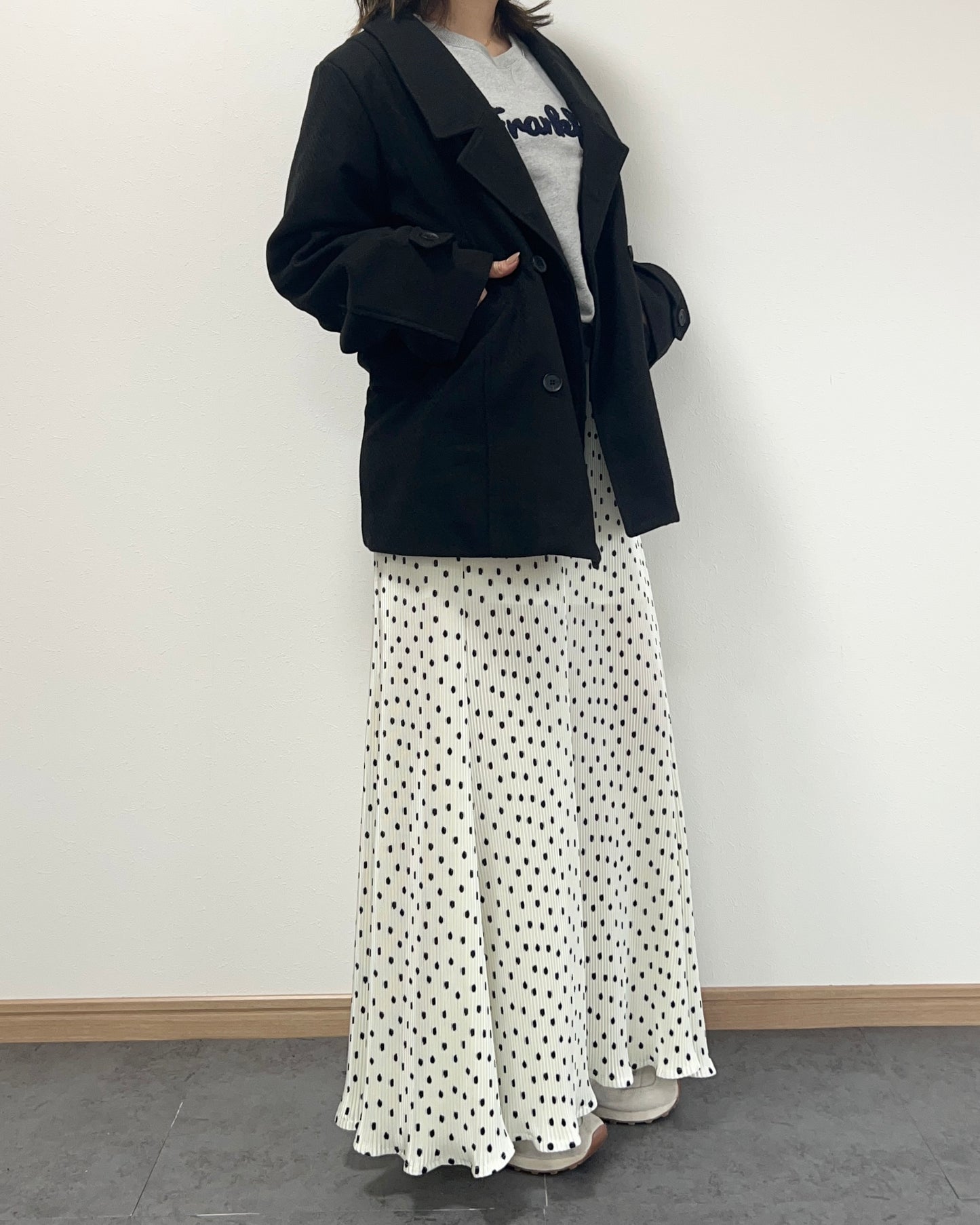 襟のシャープな形とオーバーにすることで深めになったVネックラインや落ちた肩が小顔効果と肩周りをコンパクトに見せてくれます。