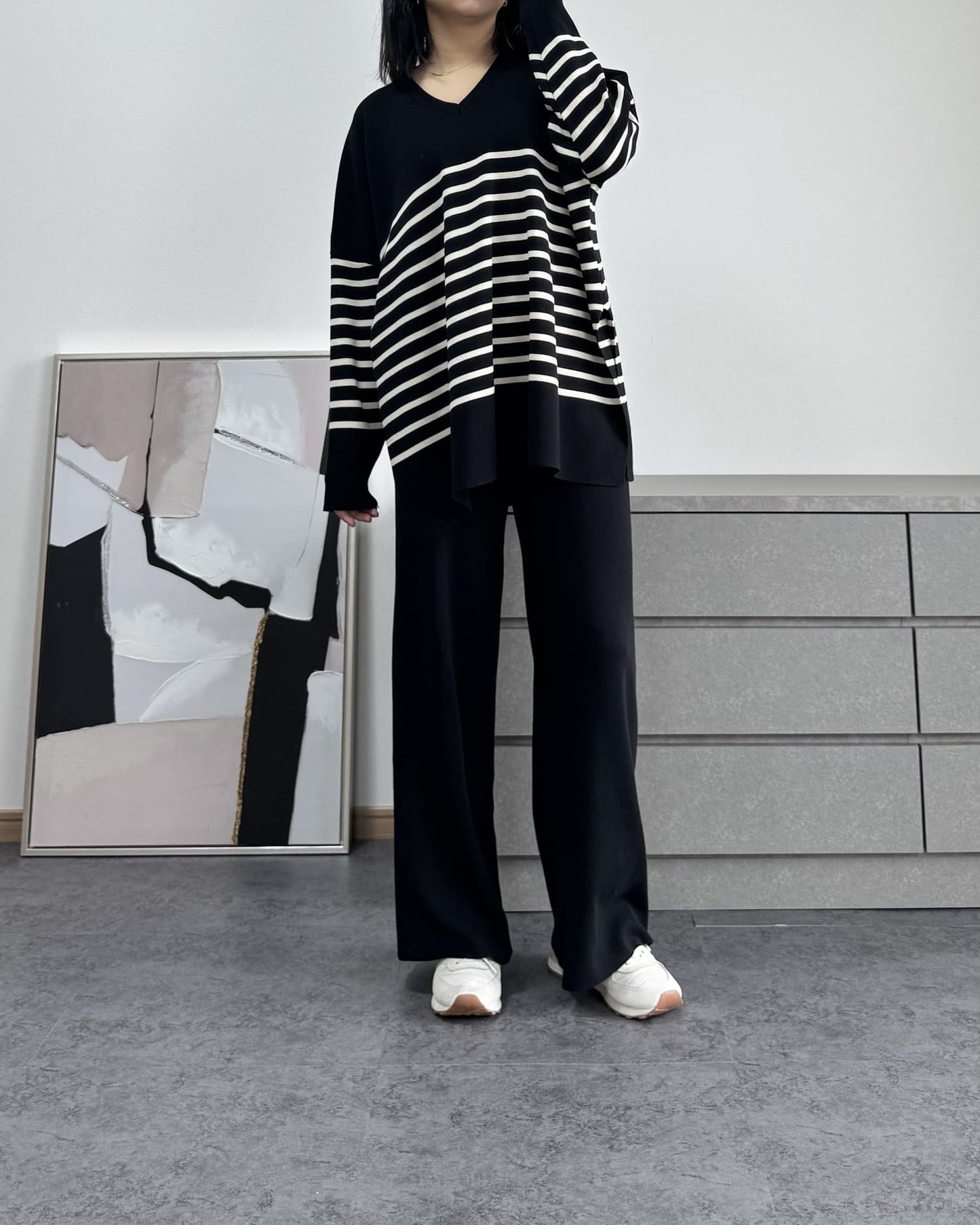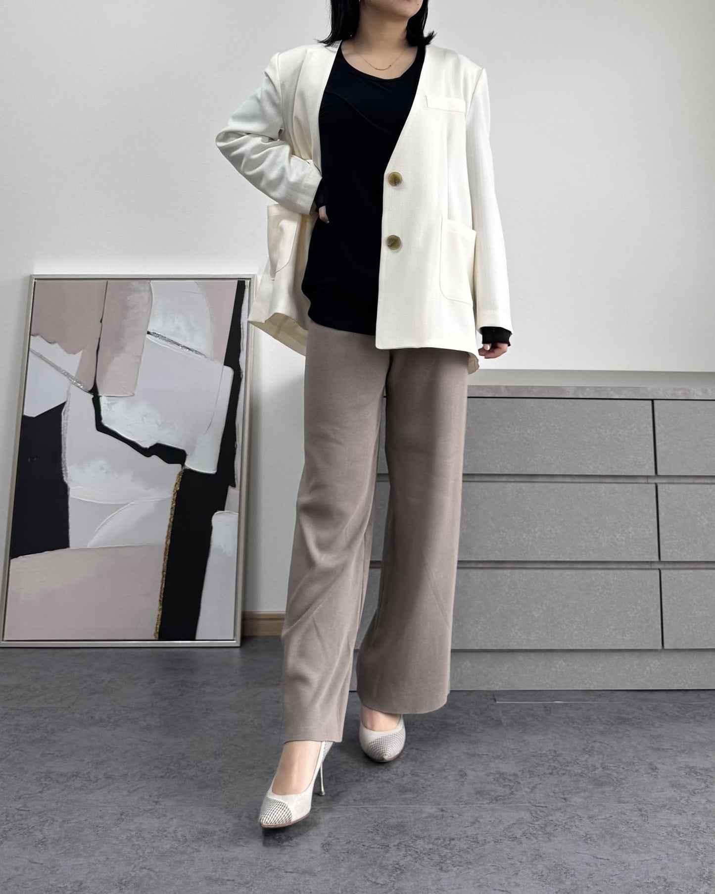 形やサイズ感、生地は以前とほぼ変わらず、ゆったりサイズですが下に落ちやすく膨らみにくい質のいい生地に、さらに膨らみを抑える両サイドのスリット、首元はすっきり見えや小顔効果が期待できるVネック、ボトムスはセミワイドフレアにすることで、程よく足のラインを出す美脚形状♡